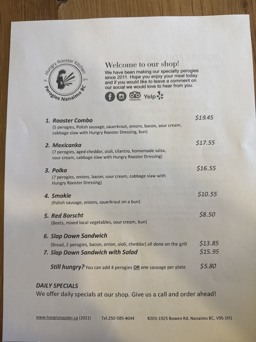 Welcome to Hungry Rooster, a gem located at 1925 Bowen Rd #203 in Nanaimo, BC. Specializing in homemade perogies made from cherished family recipes, this establishment is quickly becoming a local favorite. The menu features delightful options like the Rooster Combo, which brings together five perogies packed with bacon, onions, and more, served with hearty sides like sour cream and slaw for just CA$19.45. Vegetarian offerings include the Mexicanka, showcasing flavorful aged cheddar and homemade salsa.